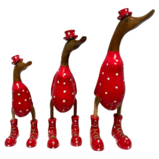 A Duck Wooden Red With White Polka Dots Boots And Hat