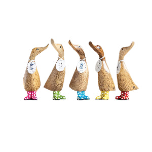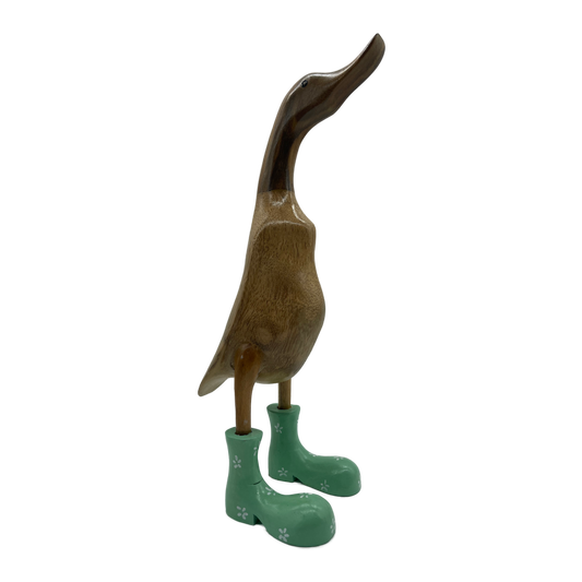 A Bamboo And Teak Duck With Pretty Grey Flowers And Boots