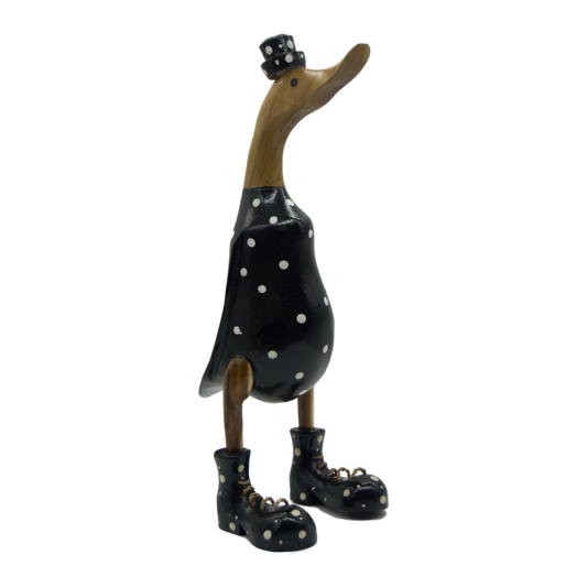 A Duck Wooden Black With White Polka Dots Boots And Hat